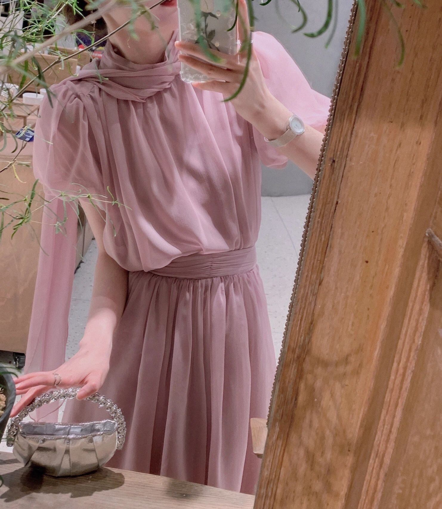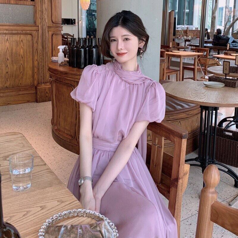 女性フレンチツーピースセット夏パフスリーブハーフカラートップスウエストスカート 2022 紫色の服セット サマー 夏物 パープル
