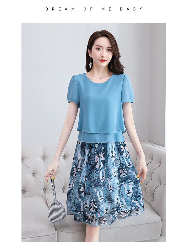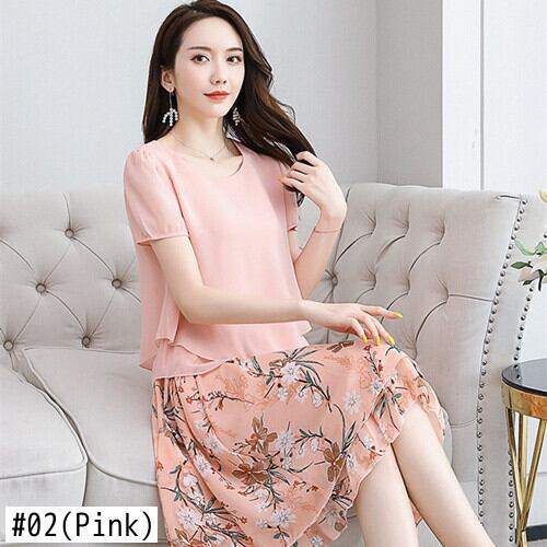 ホットシフォンバージョンルーズベリースリム花柄女性ツーピーススカートラウンドネック半袖弾性ウエストレディスーツ ショート ハーフスリーブ エラスティック 伸縮 Oネック