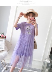 メッシュパッチワーク Tシャツドレス女性の夏の半袖 O ネックルーズ膝丈ドレス ショート ハーフスリーブ サマー 夏物 Oネック