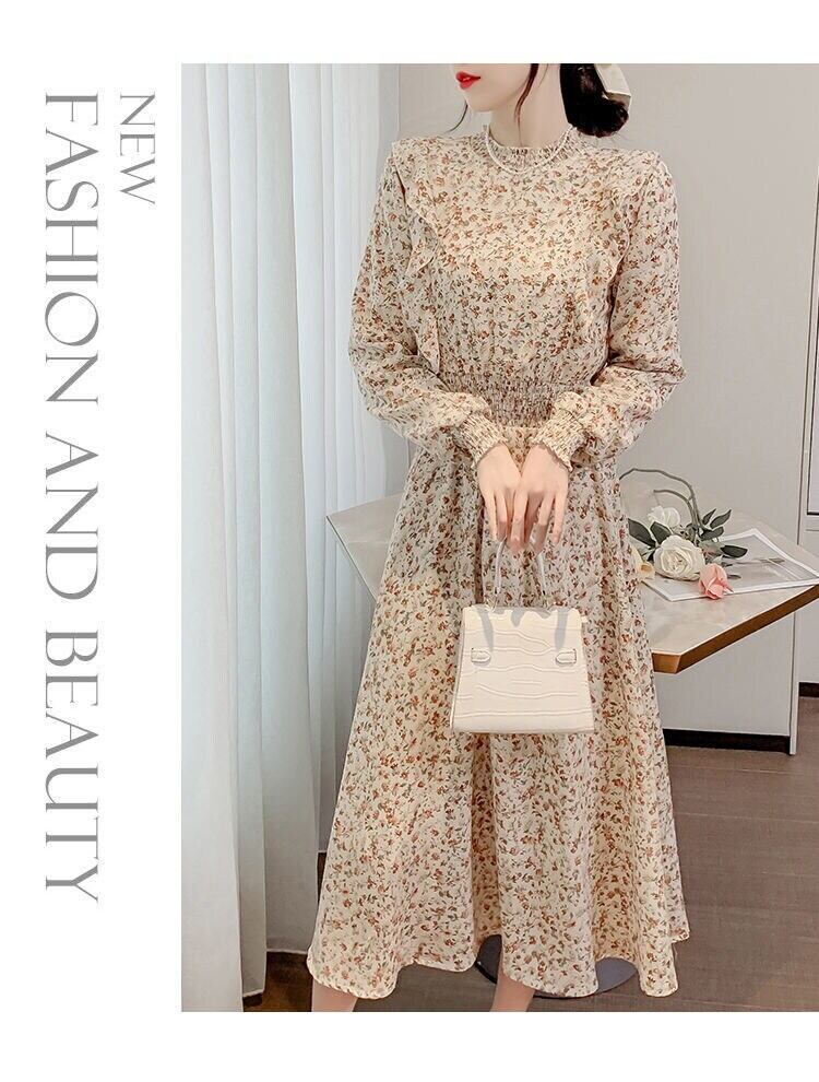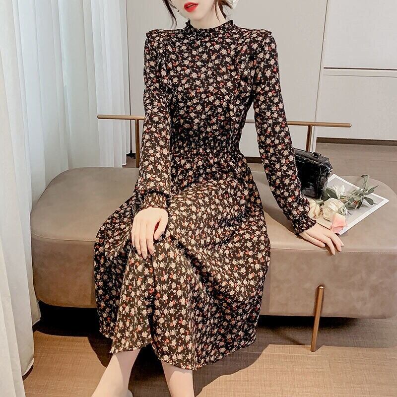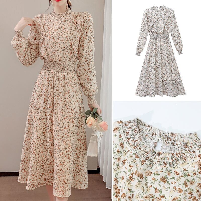 女性ロングスリーブウエストスタンドカラーミディドレス秋花柄フリルシフォンスリムパーティードレスレディ 長袖 オータム 秋物