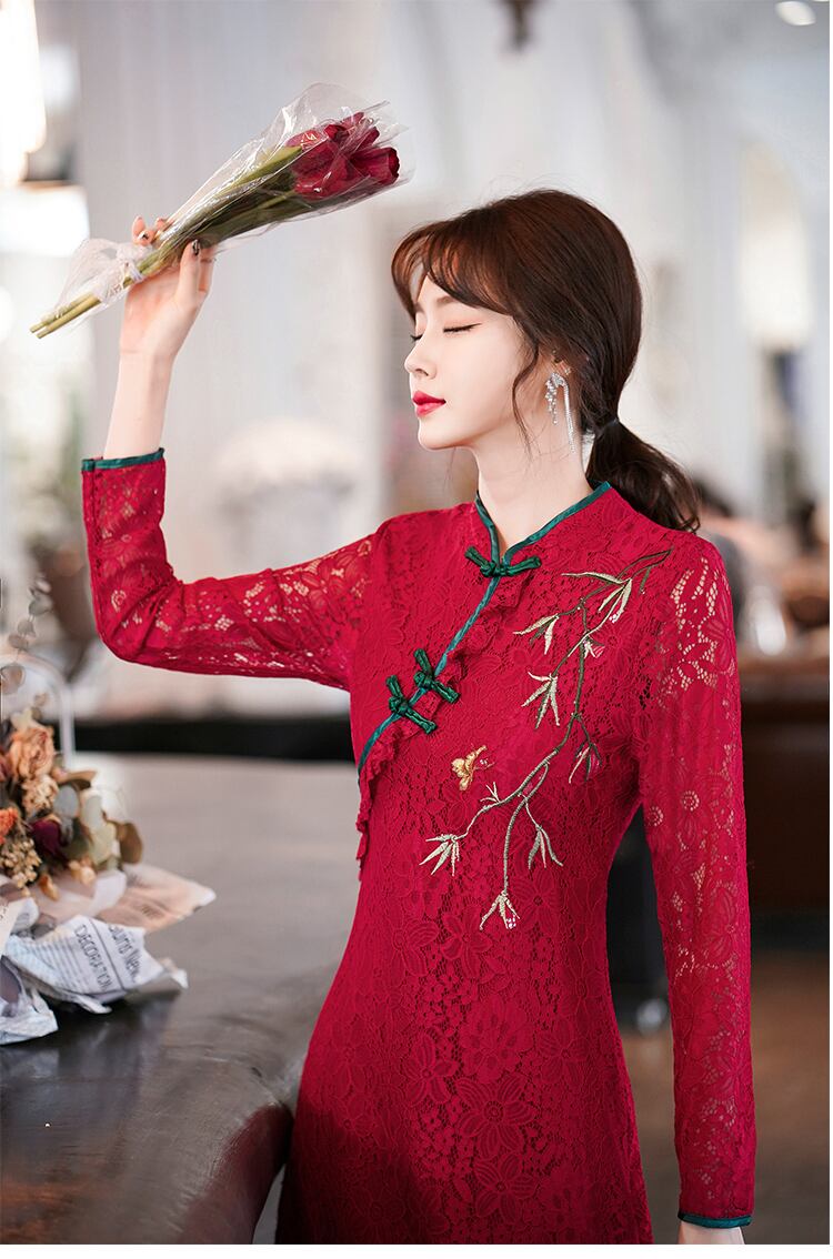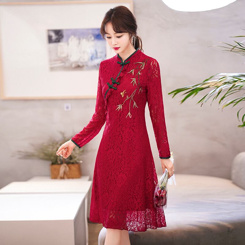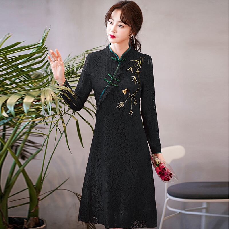 スタンドカラーレース刺繍改良されたチャイナ女性長袖レトロバックル中国風のドレスの女性の服 ロング