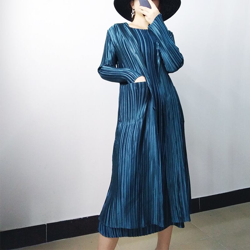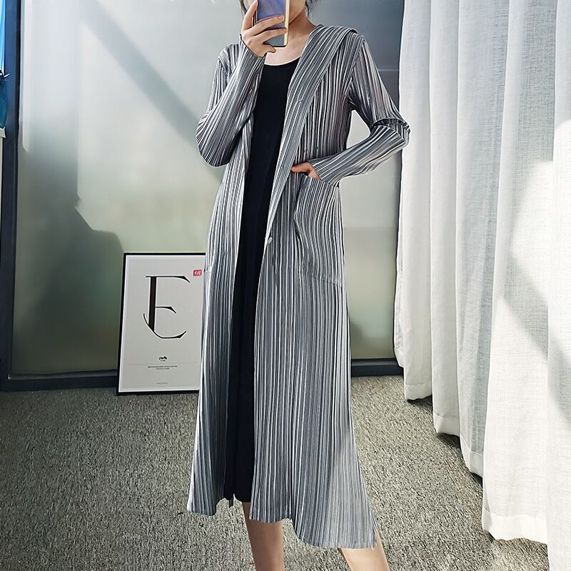 秋長袖miyakプリーツスリムトレンチコート女性無地ポケットシングルブレストフード付きウインドブレーカー ロング オータム 秋物 ソリッドカラー