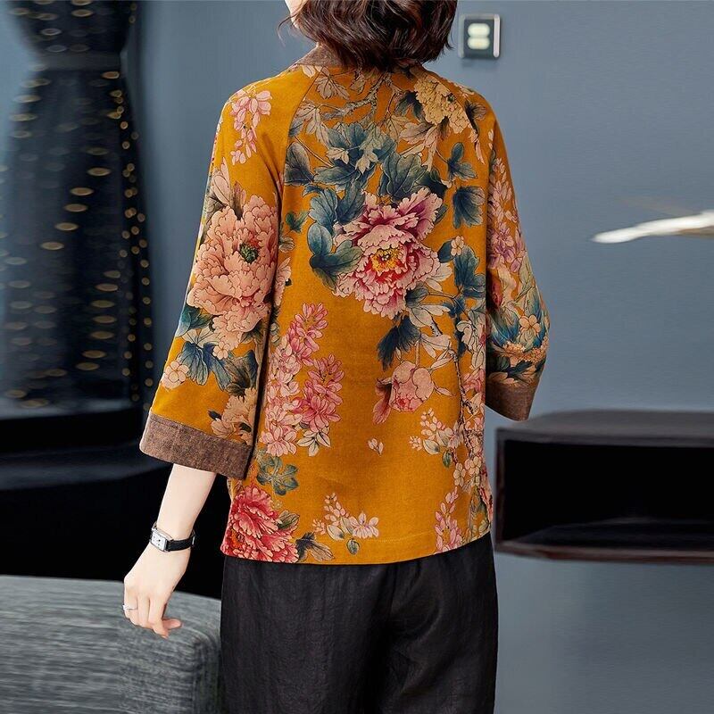 女性花柄トップスとブラウス秋シャツ七分袖ルーズブラウストップ オータム 秋物