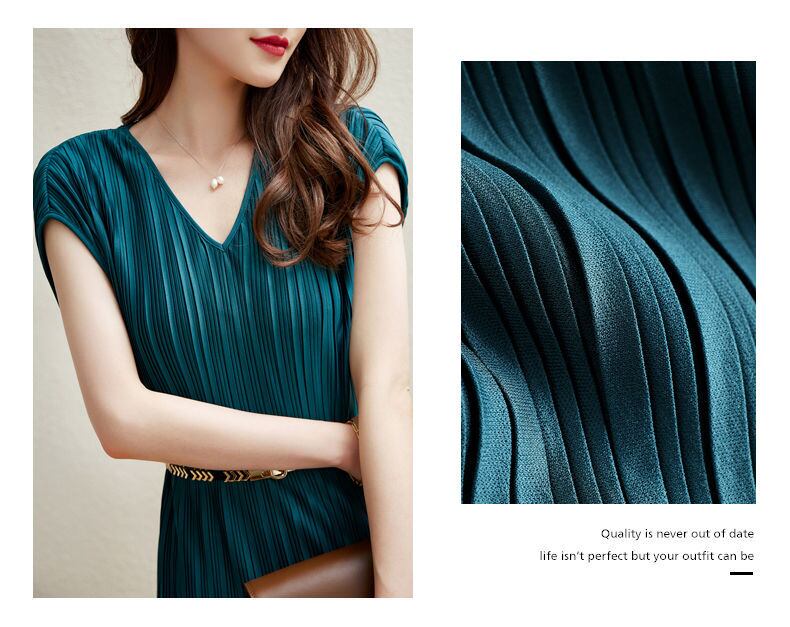 夏 V ネックプリーツドレスとベルトの女性半袖固体気質緩いミディドレス Vestidos ショート ハーフスリーブ サマー 夏物 ハーネス Vネック ソリッドカラー