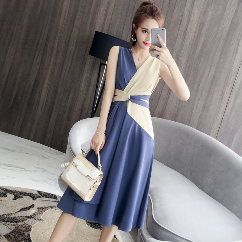 夏 2021 女性パッチワークミディタンクドレスウエストノースリーブ V ネックドレスとサッシブルー Vestidos サマー 夏物 Vネック