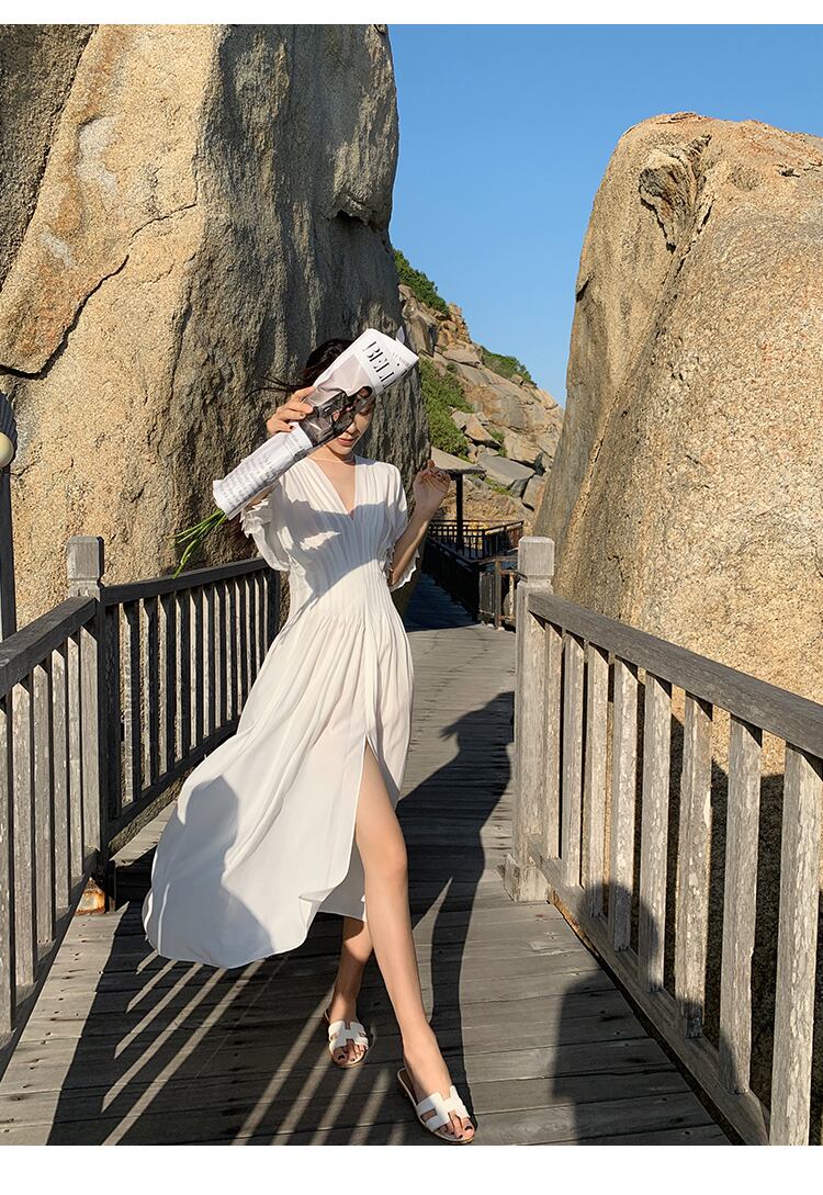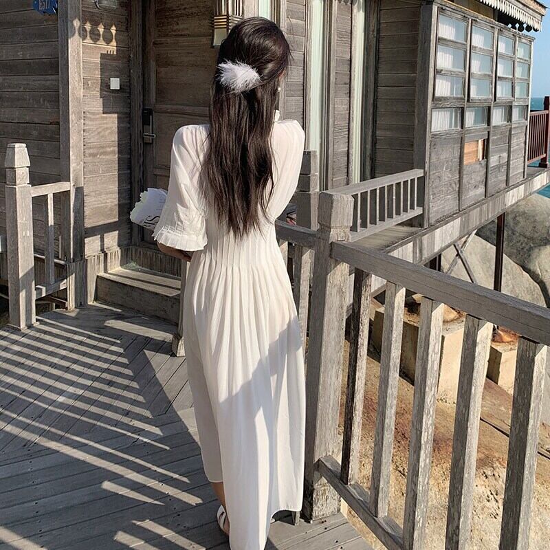 滑走路コート スタイル ホワイト プリーツ スプリット シーサイド リゾート ビーチ ミディ シャツ ドレス トレンド シックで女性の夏のドレス サンドレス サマー 夏物