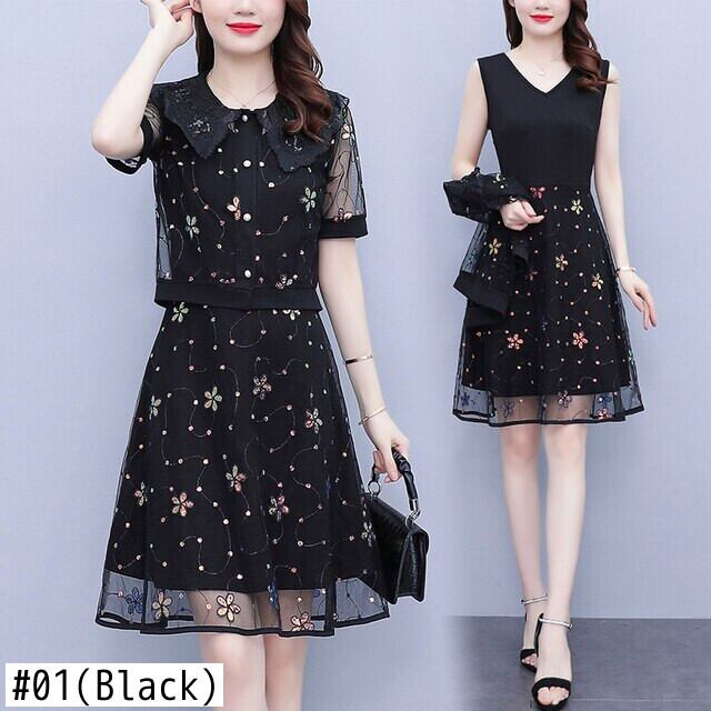 2022 夏の花刺繍服セット半袖メッシュパッチワークトップススリム A ラインタンクミニドレス女性ツーピース ショート ハーフスリーブ サマー 夏物 花柄 Aライン