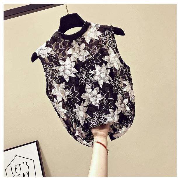 2021 夏ノースリーブオールマッチスリムシフォンブラウスラウンドネックストレートレースプルオーバー印刷の服の女性 サマー 夏物 Oネック
