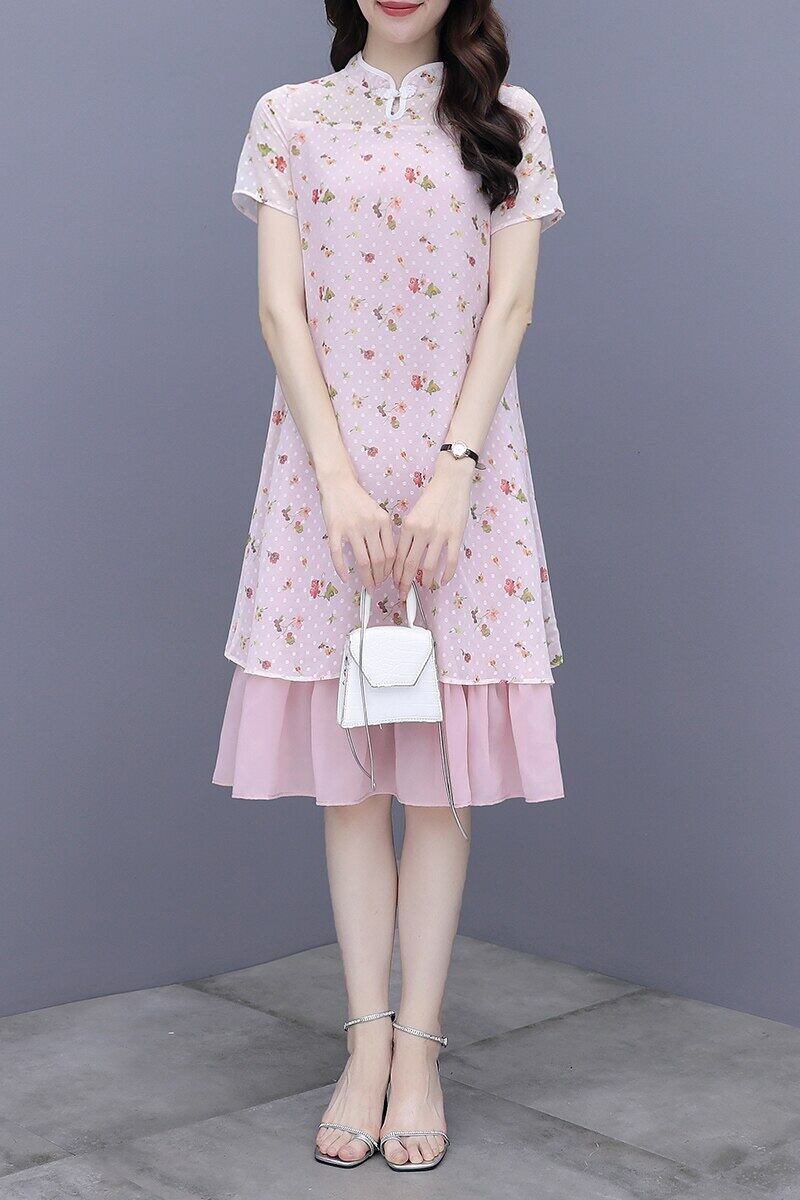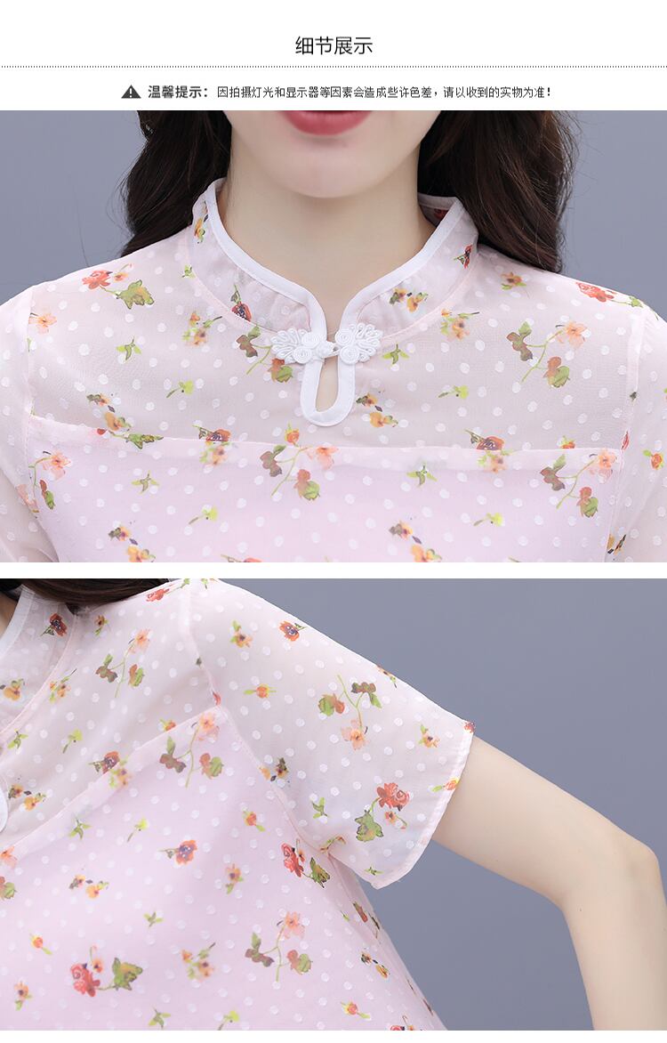 花柄改良されたチャイナ女性半袖スタンドカラーパッチワーク膝丈ドレス中国風のモダンな袍 ショート ハーフスリーブ