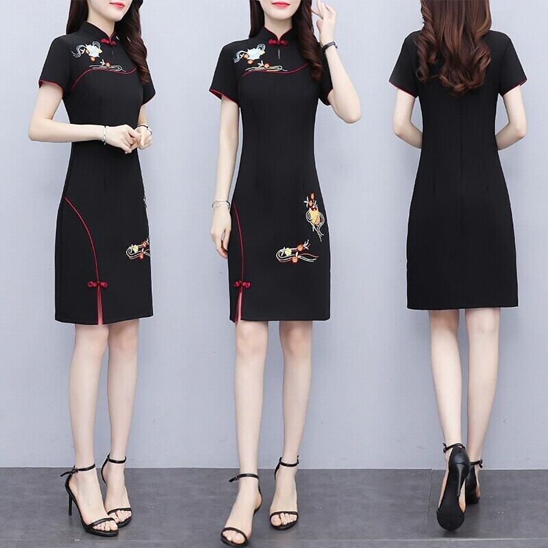 半袖刺繍チャイナドレス夏スリムスタンドカラー中国風のミニドレス女性袍 ショート ハーフスリーブ サマー 夏物