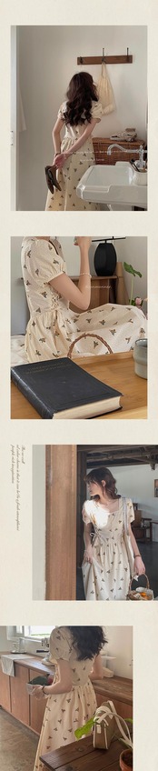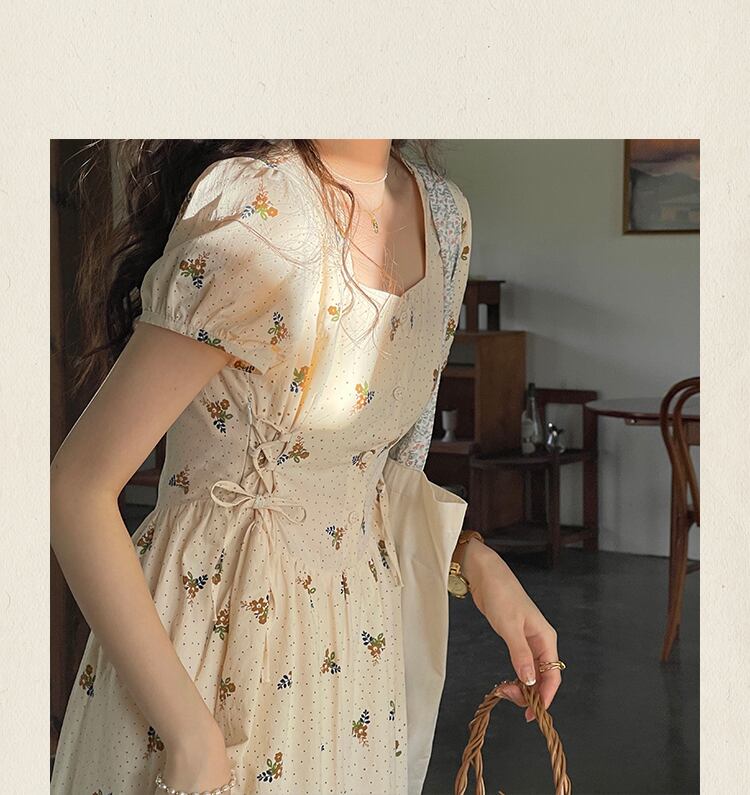 原宿スタイル スクエアカラー パフスリーブ 花柄ドレス 夏 ese A-word ウエスト スリムフィット 森ミディドレス かわいい サマー 夏物 スクウェア