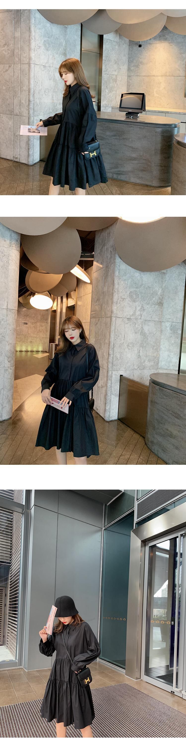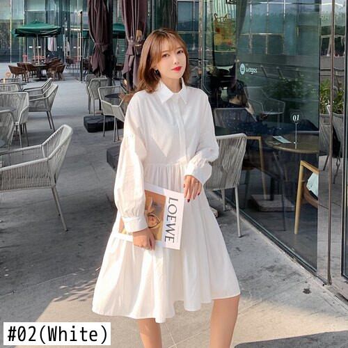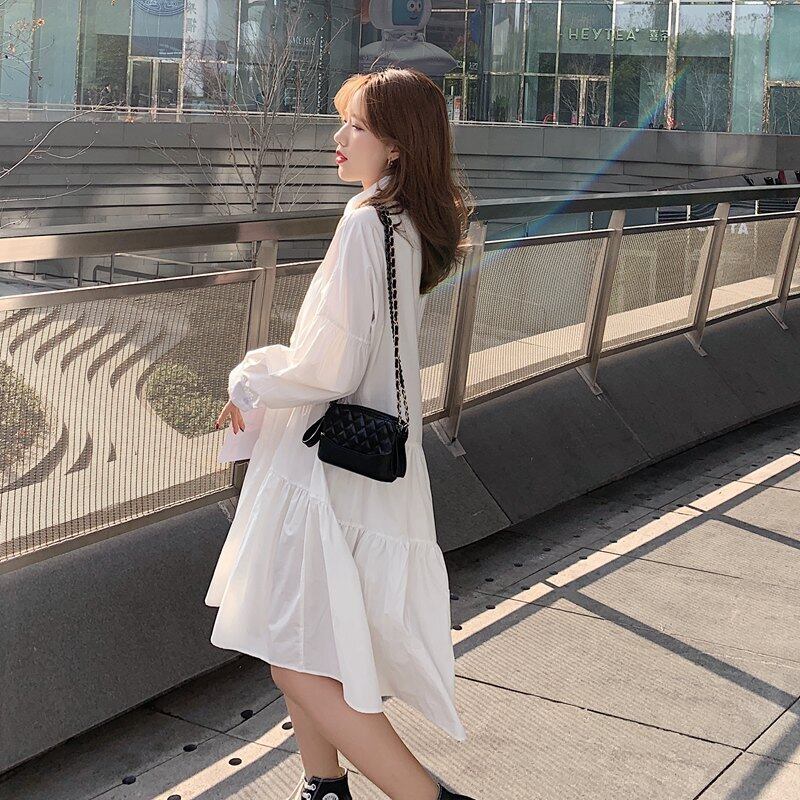 秋のシックな無地長袖シングル ブレスト シャツ ドレス ボーイ フレンド スタイル大きいサイズ ルーズ ホワイト ラペル ミディ ドレス ロング 大きめサイズ オータム 秋物 ソリッドカラー