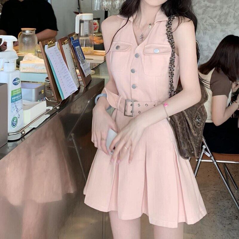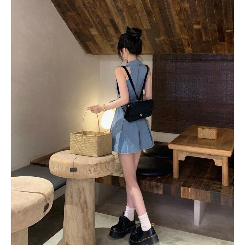 レトロなチュニック デニム ドレス女性ラペル ボタン ポケット プリーツ ミニ ジーンズ ドレス ベルト付き ハーネス