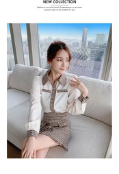 チェック柄パッチワーク長袖シャツトップウエスト千鳥格子 Tel ミニスカート女性春ボタン 2 ピース服セット ロング スプリング 春物