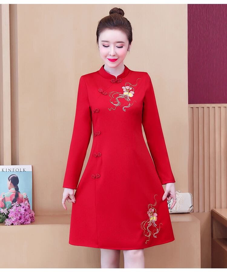 秋冬プラスベルベット厚み改善されたチャイナ女性長袖スタンドカラー刺繍中国風のドレス ロング オータム 秋物 ウィンター 冬物