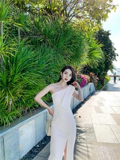 夏のタイのセクシーな弓白ピンクの女性のドレス傾斜斜め肩スリムフィットスリットノースリーブミディドレス ホワイト リボン サマー 夏物