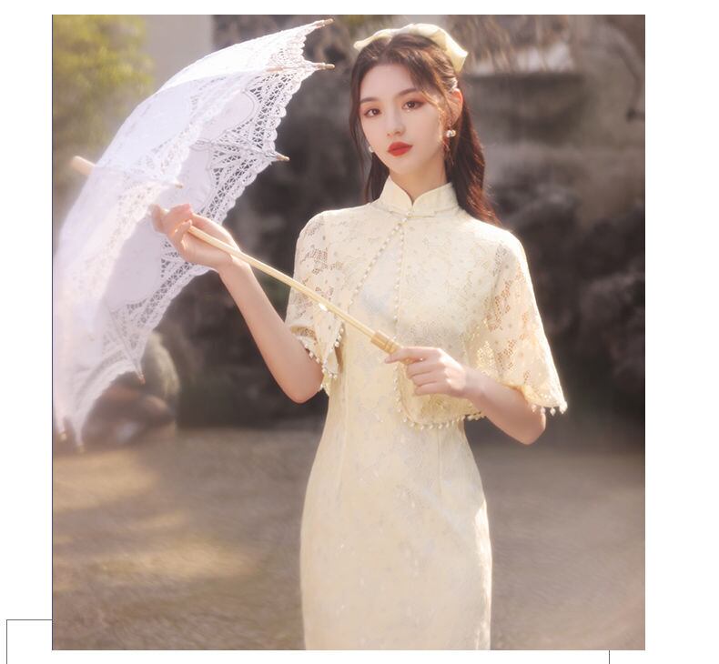 レースショールスプライシング改良されたチャイナ女性の夏のスタンドカラーソリッドスリムスプリット膝丈ドレス若い袍 サマー 夏物 ソリッドカラー