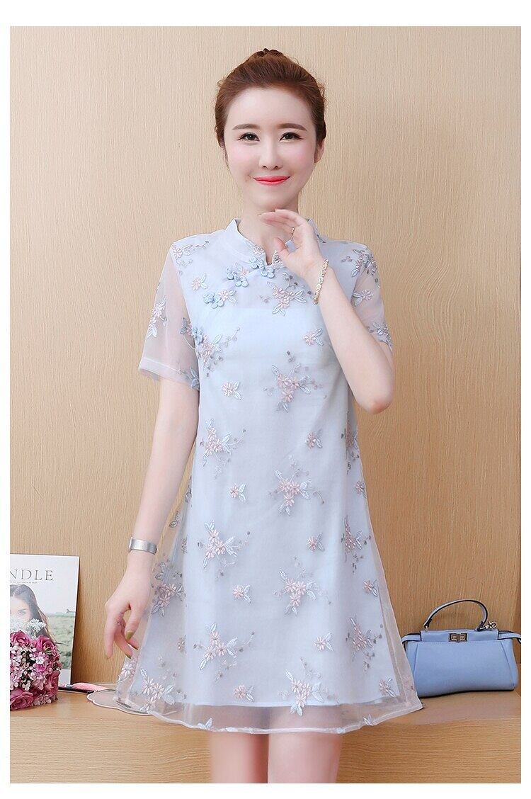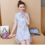 夏半袖花柄刺繍スタンドカラー改良チャイナ女性中国風のスリム A ラインミニドレス ショート ハーフスリーブ サマー 夏物 Aライン