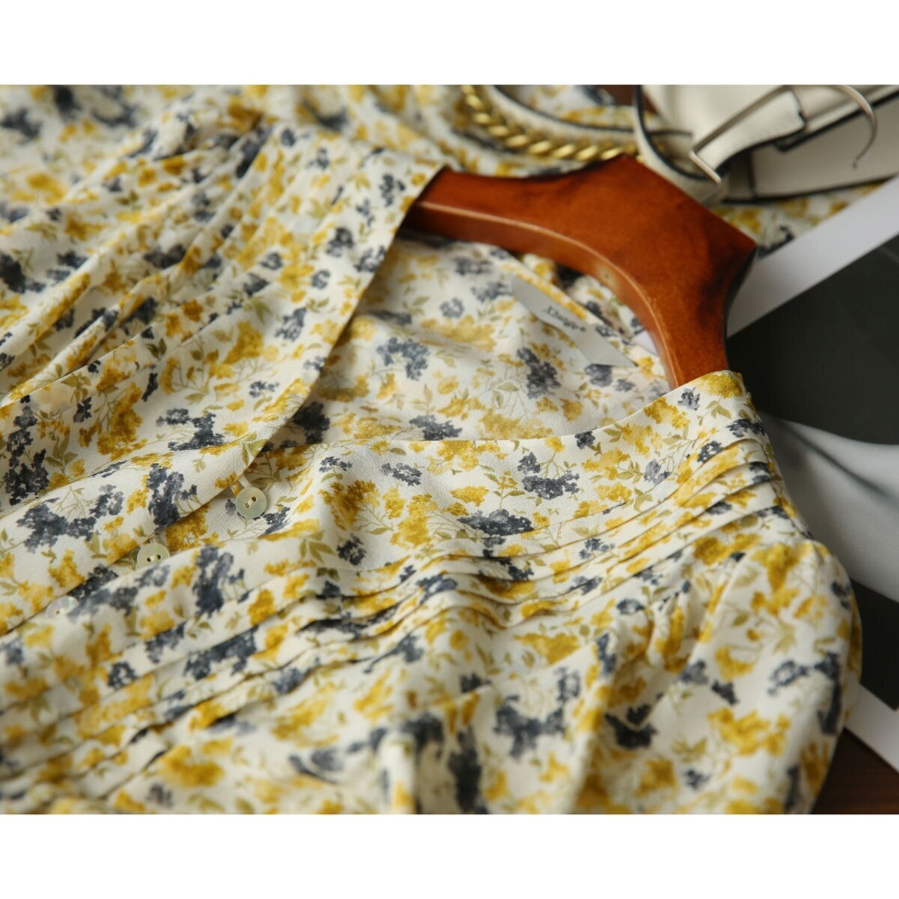 パフスリーブ花柄ドレス女性の夏の V ネックスリムウエストフォールドボタンミッドレングスドレス 2022 サマー 夏物 Vネック
