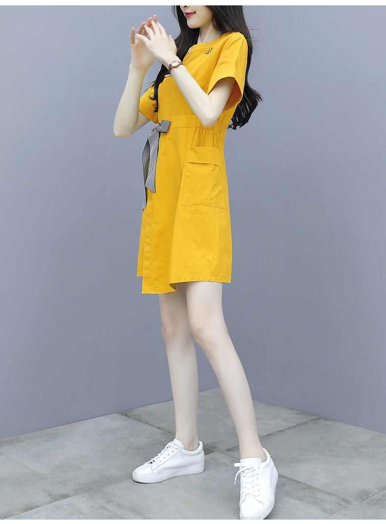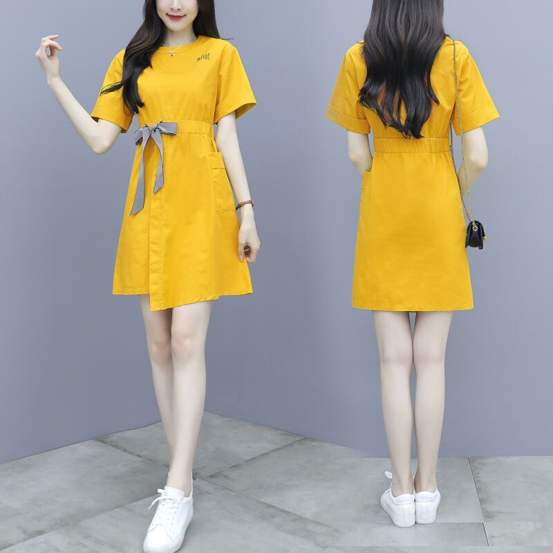 ウエストレースアップ不規則なミニドレスの女性の夏の半袖ラウンドネックスリムドレス ショート ハーフスリーブ サマー 夏物 Oネック