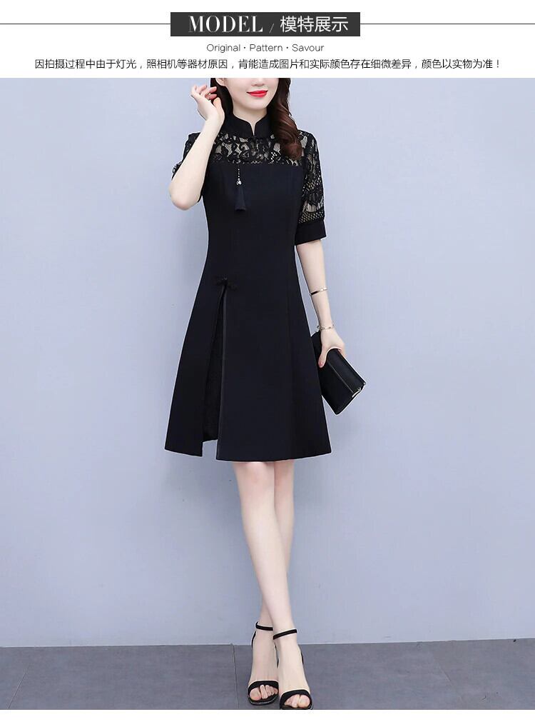 春秋の絶妙なレースステッチ半袖スリットミディドレス赤黒プラスサイズのパーティードレス女性脂肪 5xl レッド ブラック 大きめサイズ スプリング 春物 オータム 秋物