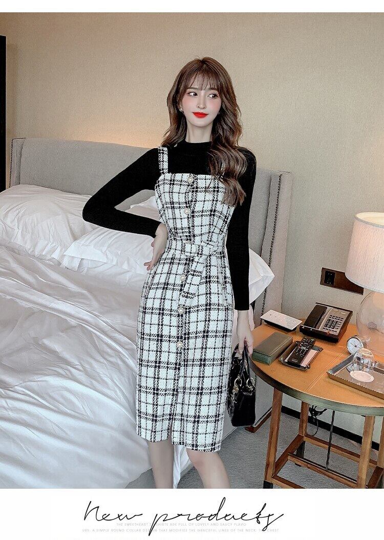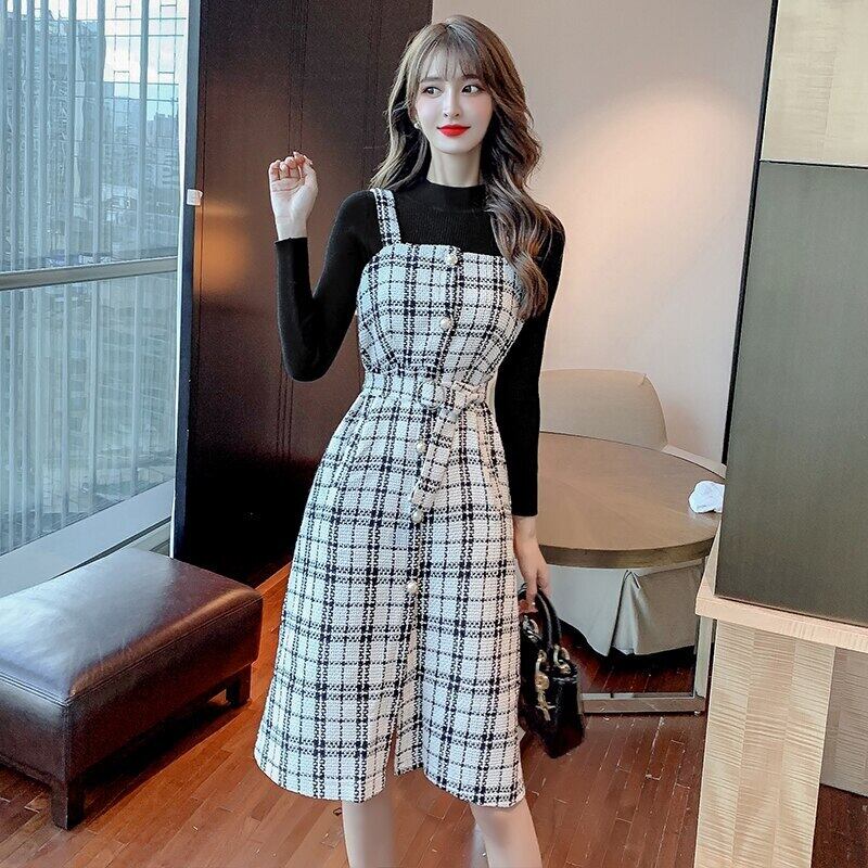 ウール千鳥格子スーツスカート女性の秋と冬の黒、白のニットトップウエストストラップドレスセーターツーピースセット ホワイト ブラック オータム 秋物 ウィンター 冬物
