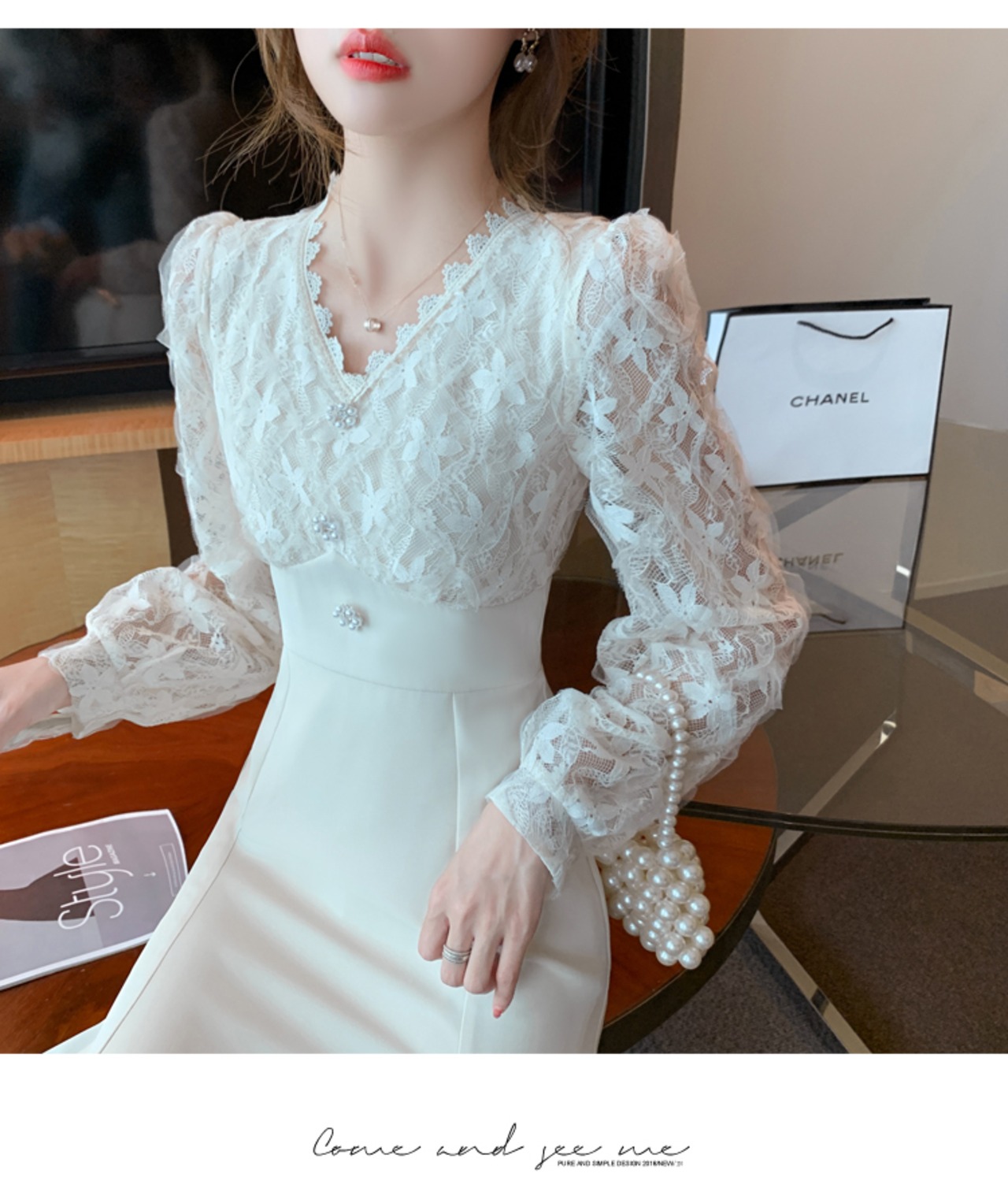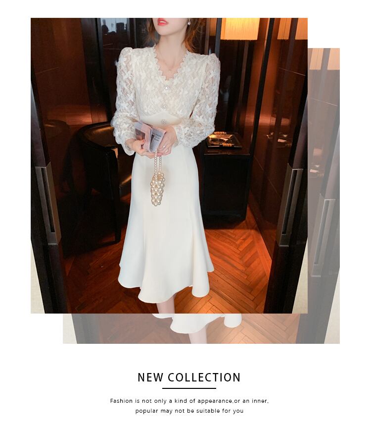 2022 春秋フレンチフィッシュテイルドレスの女性のレースステッチニッチロマンチックなキキョウミッドレングスパーティードレスホワイト スプリング 春物 オータム 秋物 フラワーデザイン