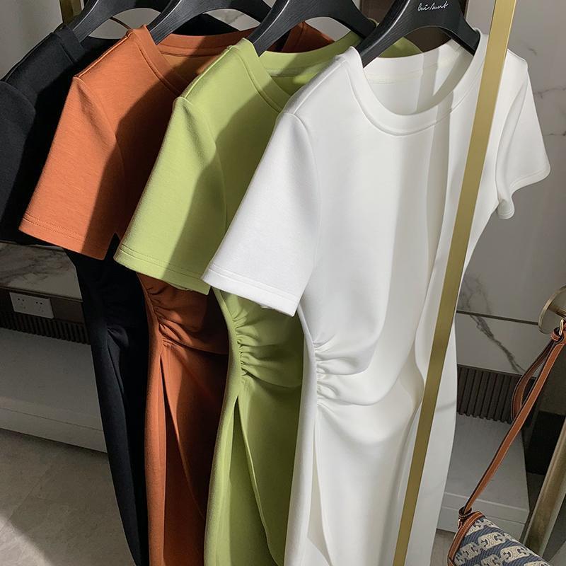 2022 夏ボディコングリーンドレス女性半袖セクシーな固体倍スリムウエスト不規則なスリットミッドレングスのドレス ショート ハーフスリーブ サマー 夏物 ソリッドカラー