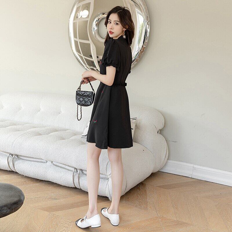 ローズ刺繍Vネックシャツドレス2022サマーウエストレトロブラックドレスレディース レッド 夏物
