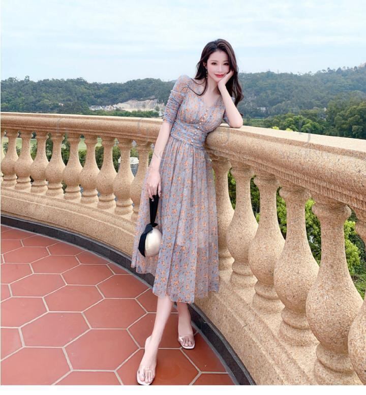 スリムウエスト V ネック花柄 A ラインドレスの女性の夏のハーフスリーブボタンシフォンパーティーロングドレス 半袖 サマー 夏物 Vネック Aライン