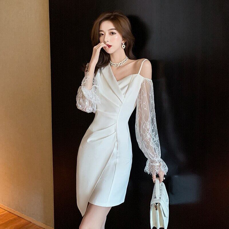レースパッチワーク不規則なストラップレス長袖ミニドレス女性スリムウエストプリーツボディコンパーティードレス ロング