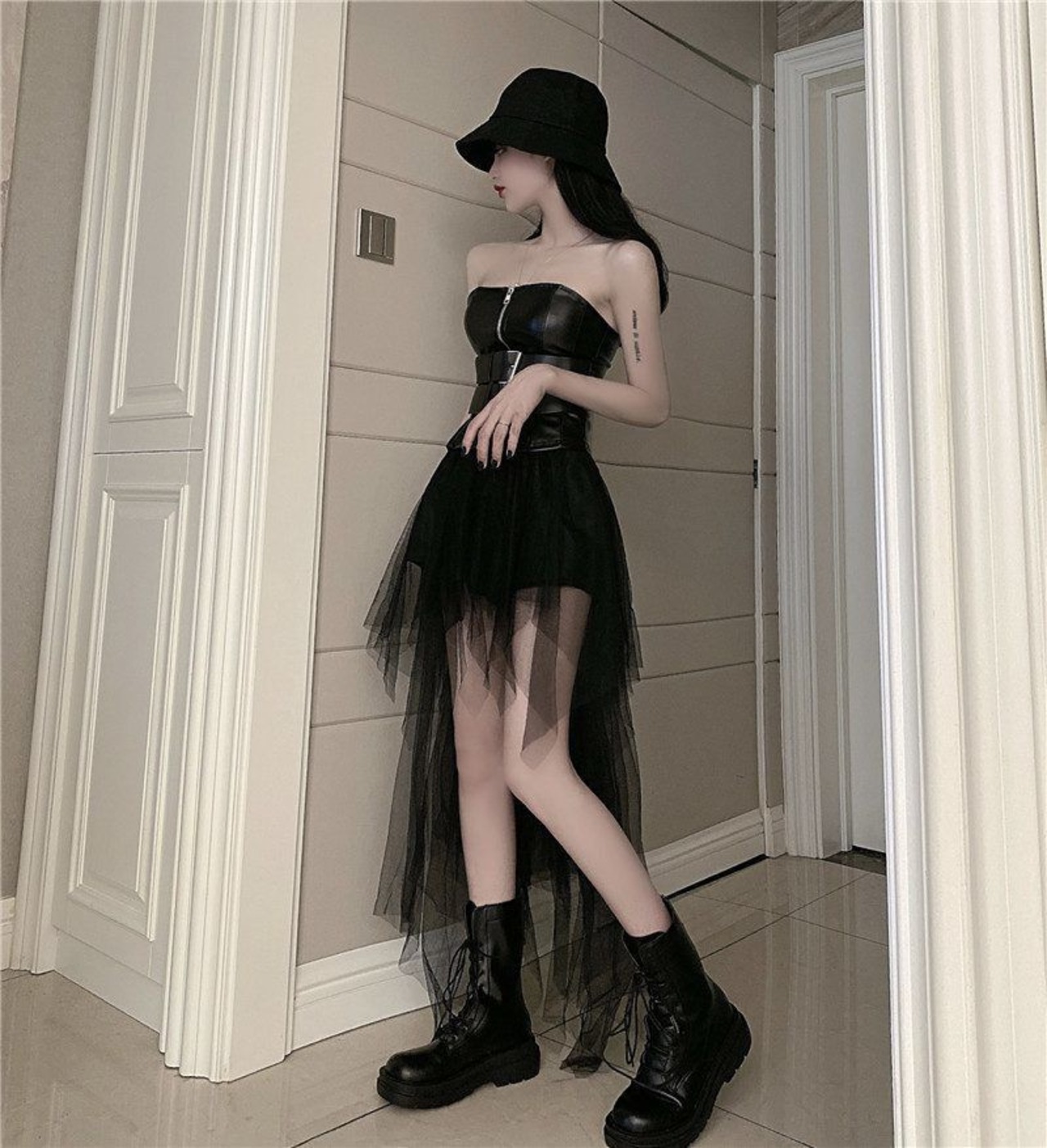 女性のセクシーなゴシック 2 点セットストラップレスジッパー PU ベルトチューブトップ + ウエスト不規則なメッシュスカートストリート服 ハーネス