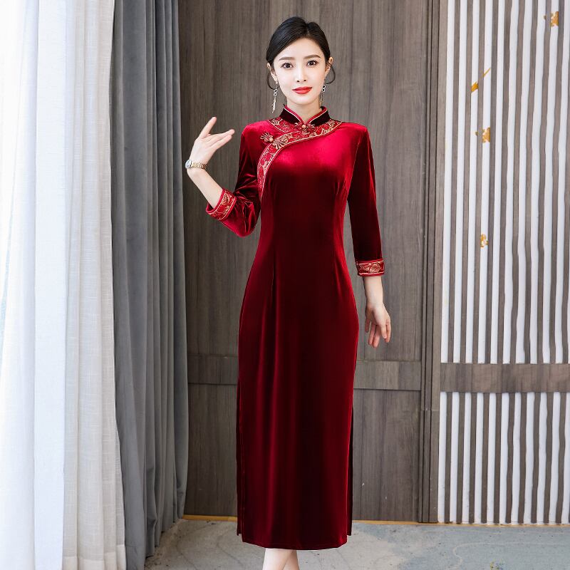 女性秋のベルベット改良されたチャイナスタンドカラー刺繍バックル分割 18k 袍中国風のスリムミディドレス オータム 秋物