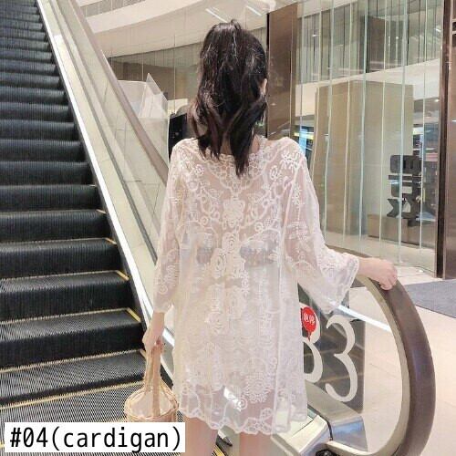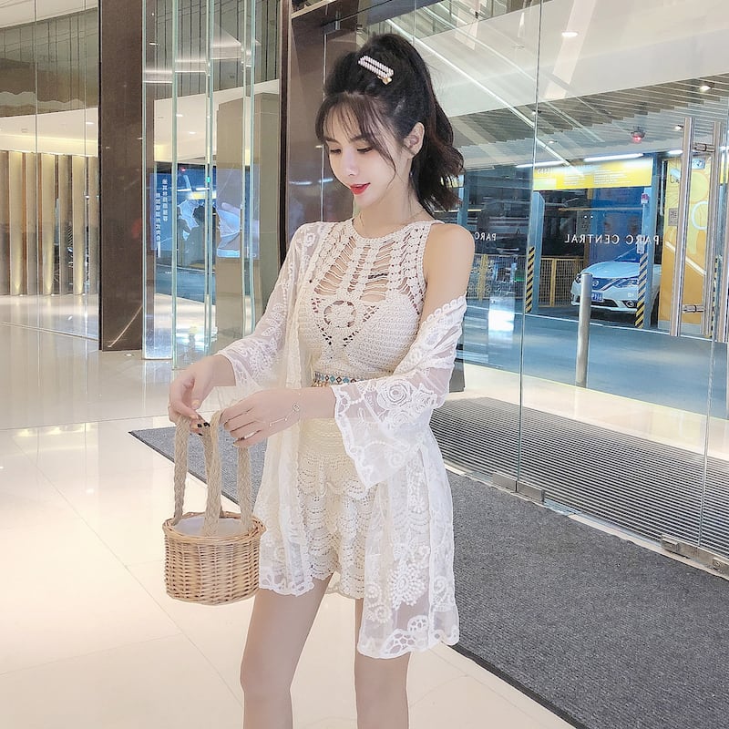 女性の夏のセクシーな自由奔放に生きるレース 3 点セット Tel クロップトップショーツ中空カーディガンホリデービーチサンウェアマッチングセット サマー 夏物 ブルマー