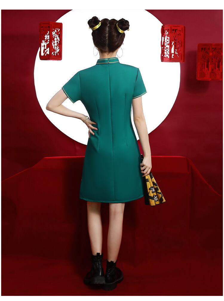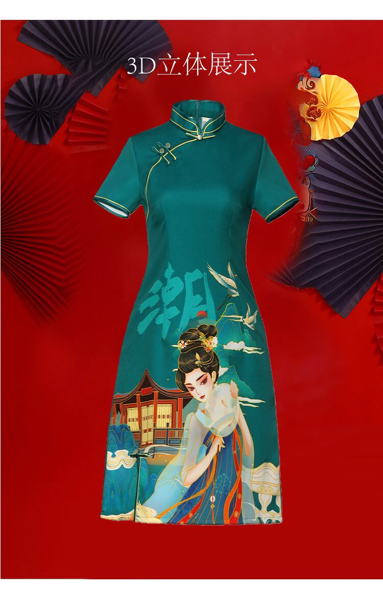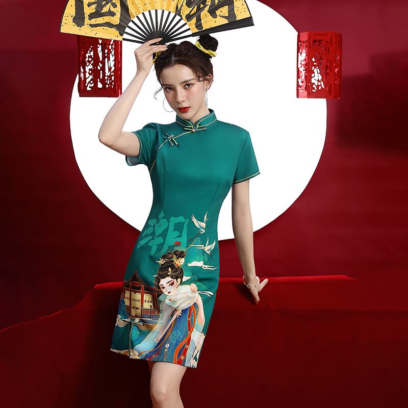 現代チャイナドレスドレス半袖スタンドカラースリムプリント夏中国風のスプリットミニドレス女性 ショート ハーフスリーブ サマー 夏物