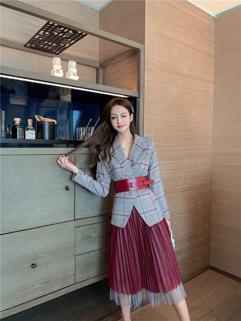 2 個セット秋の女性の格子縞のブレザーとジャケット作業オフィスレディスーツ + ワインレッドプリーツメッシュスカートとベルト オータム 秋物 ハーネス 会社 学校 通勤や通学にも