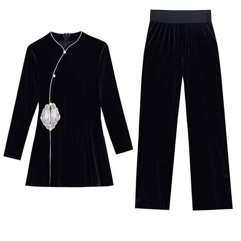2023 秋中国風 2 個セット - エンドスリムレトロ刺繍ベルベットジャケットトップス + ストレートレッグパンツ韓服 2 個セット レッド オータム 秋物