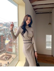 秋冬シックな気質ドレススリムウエストレースアップニットミッドレングスセータードレス気質 Vestidos オータム 秋物 ウィンター 冬物