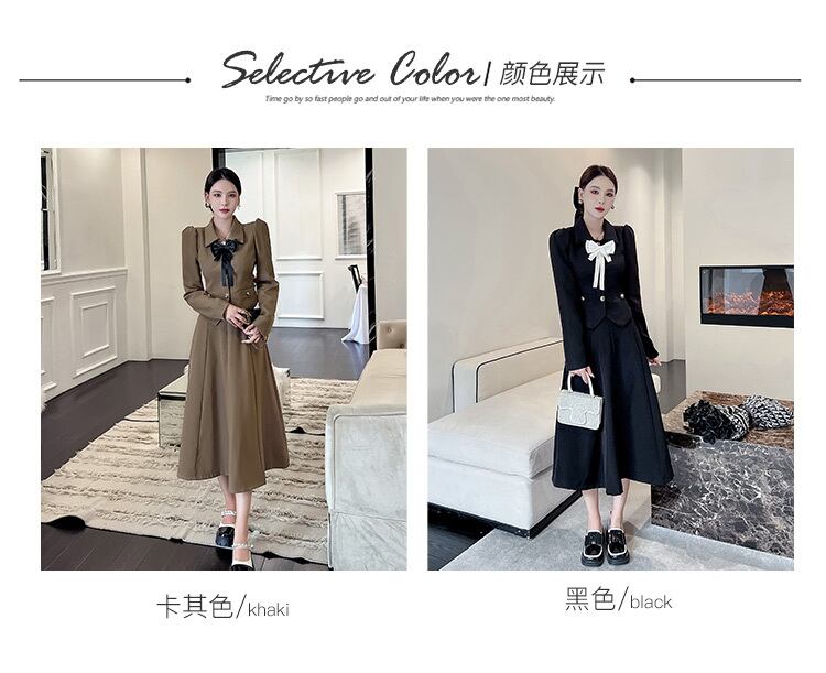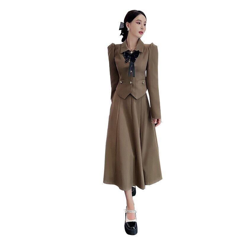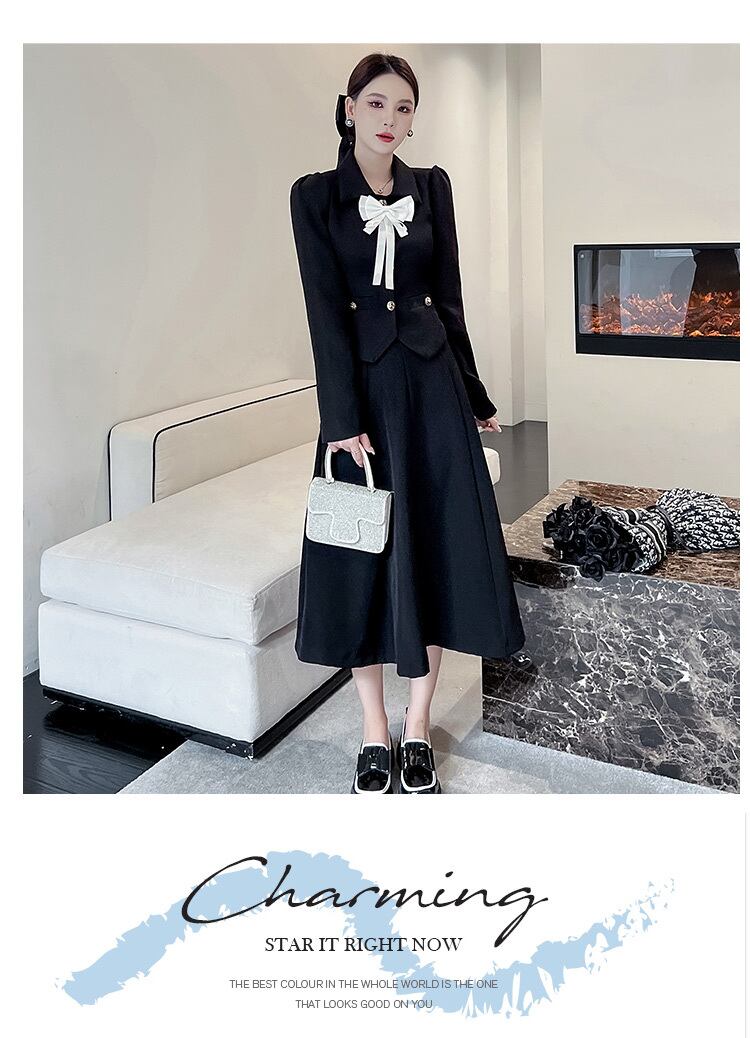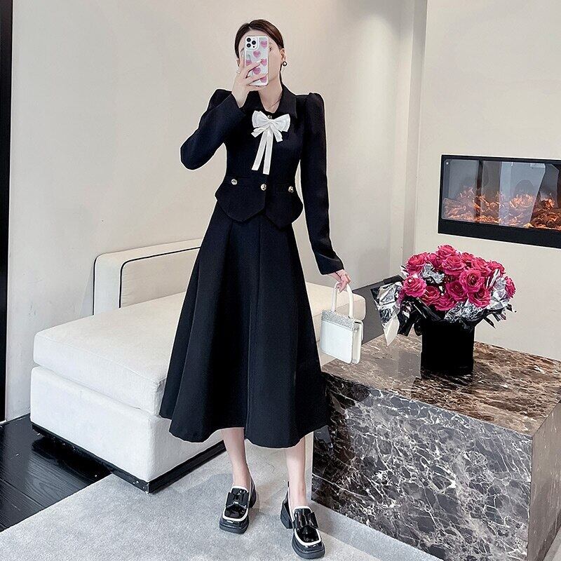 秋 2 個セットレディース衣装ボウウールコート A ラインスイング黒スカート + ロングパフスリーブシャツ 2 個スーツ ブラック リボン オータム 秋物 Aライン