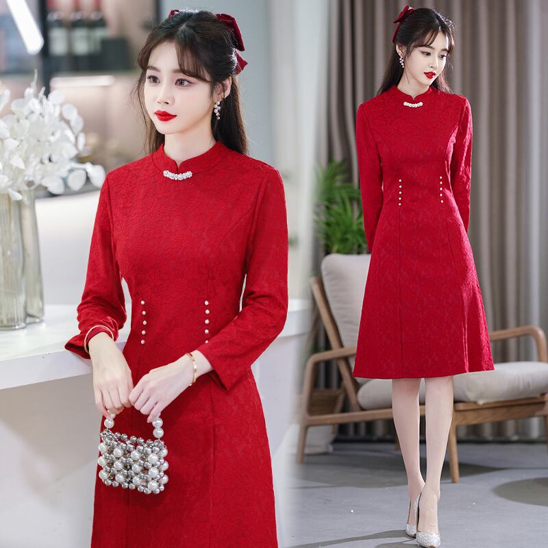 and Elegance レッドパール チャイナドレス トーストドレス レース 大きいサイズ 宴会 パーティードレス レディース 大きめサイズ 真珠