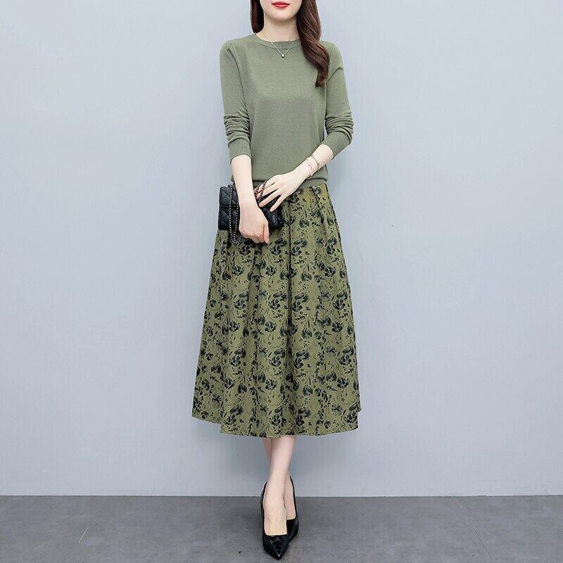 女性春秋セット長袖薄型セータープレスプリーツ大スイングハーフスカートツーピースセット ロング スプリング 春物 オータム 秋物