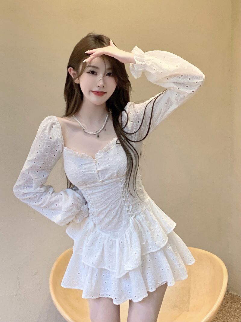 長袖中空アウトスリムウエストミニドレス女性春夏レースアップセクシーなパーティークラブドレス ロング スプリング 春物 サマー 夏物