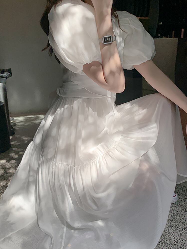 2022 Y2K レトロパフスリーブミディドレス女性の夏ホワイトグリーン V ネックプリーツウエストドレスサンドレス サマー 夏物 Vネック