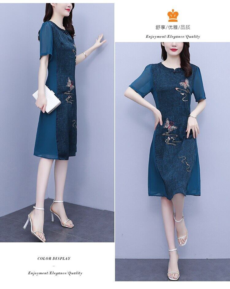 2022 夏服緩いプラスサイズの中国風のチャイナドレス女性の高貴で繊細な蝶刺繍ミディドレス 大きめサイズ サマー 夏物