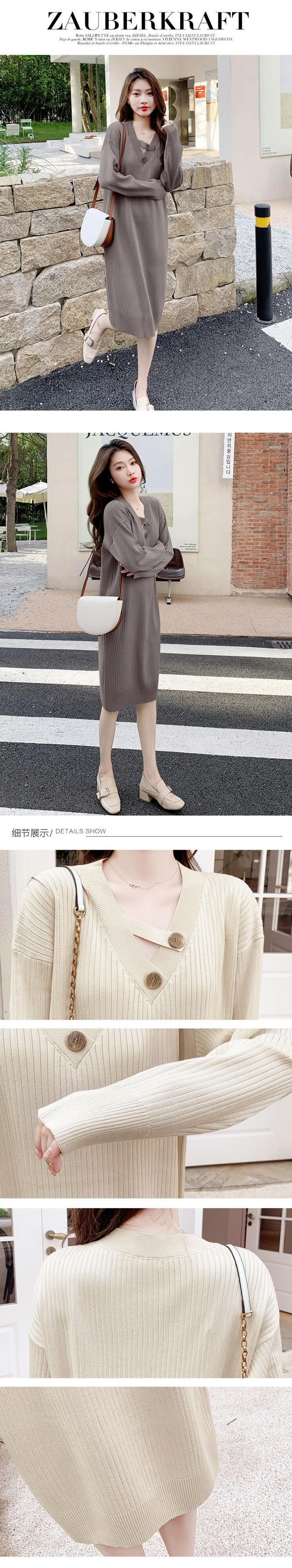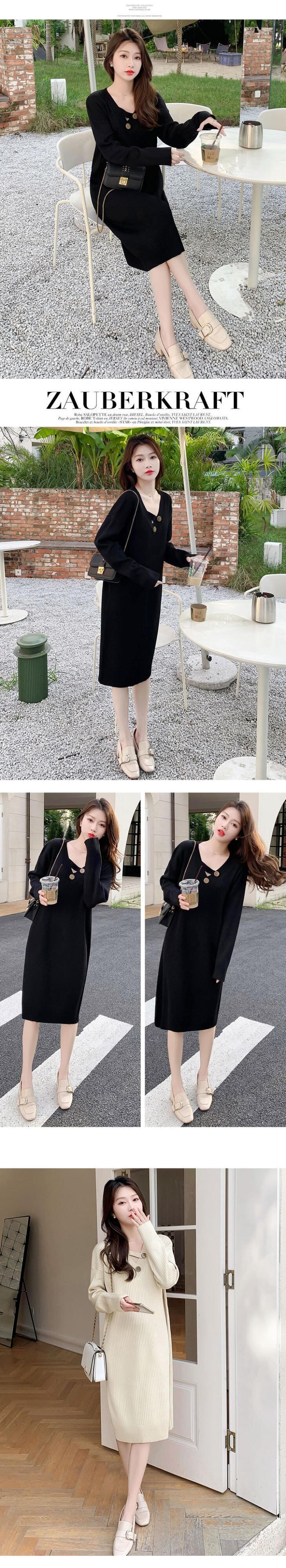 Y2K 2022 秋冬ウェアミッドレングスルーズセーターシャツドレスオーバーニー V ネック底入れ黒アプリコットニットドレス女性 ブラック オータム 秋物 ウィンター 冬物 Vネック