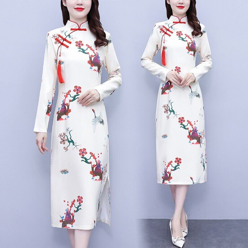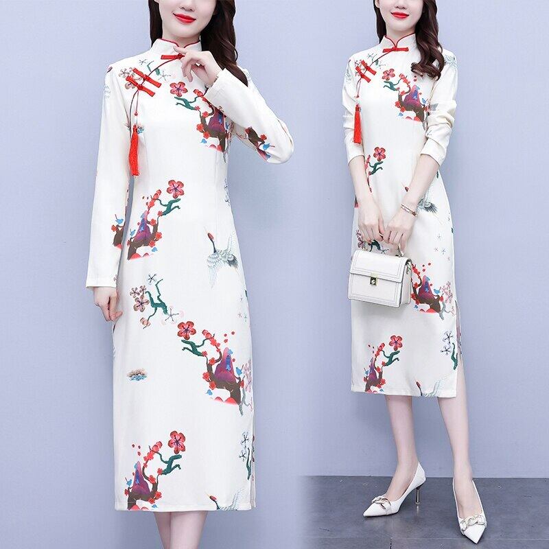 2023 春と秋花柄スリム袍中国ドレススタンドカラー長袖年気質チャイナドレス ロング スプリング 春物 オータム 秋物