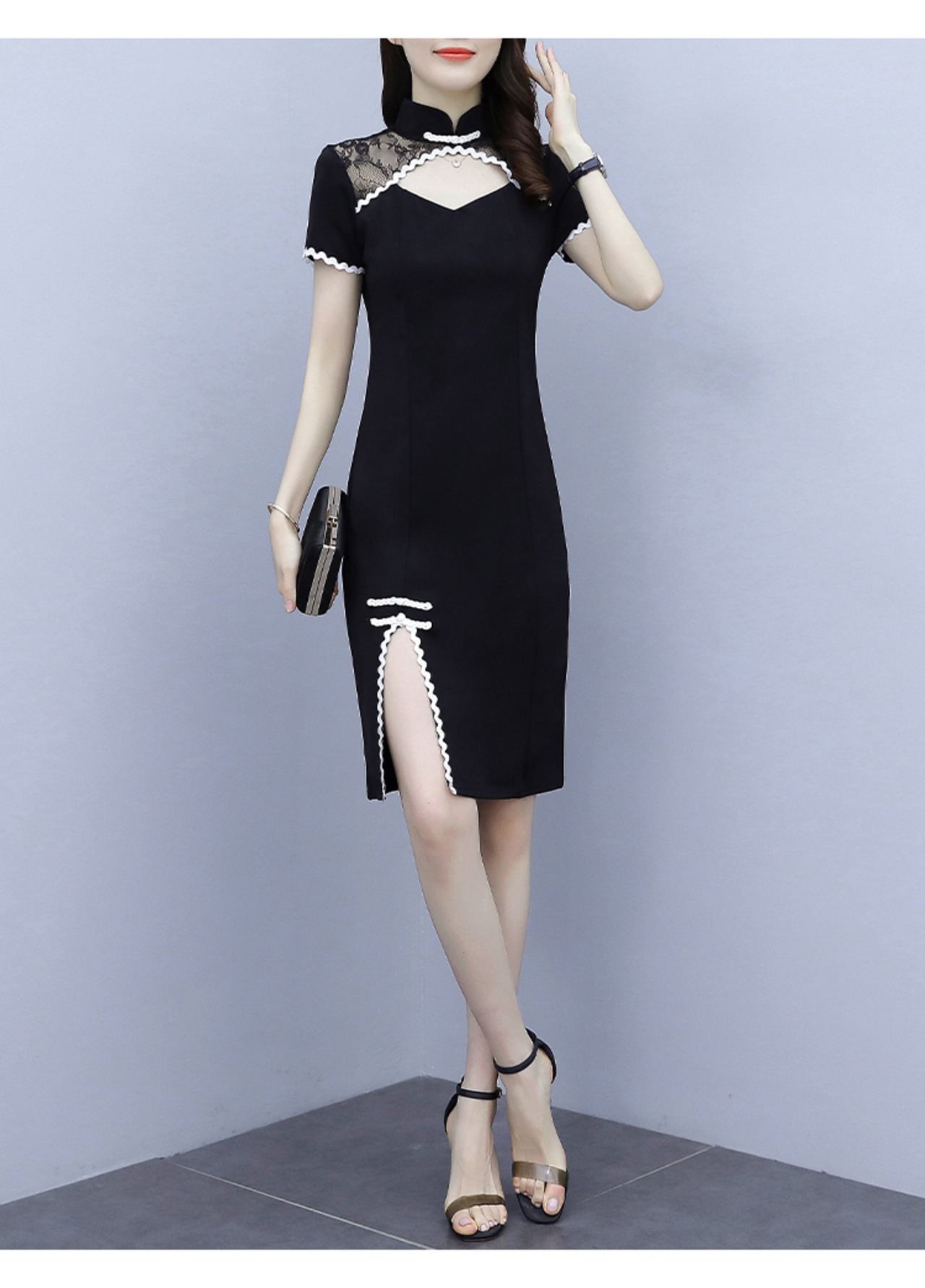 レースパッチワークチャイナドレススリム中空アウトスタンドカラースプリット中国風のミニドレス女性の夏の服 サマー 夏物
