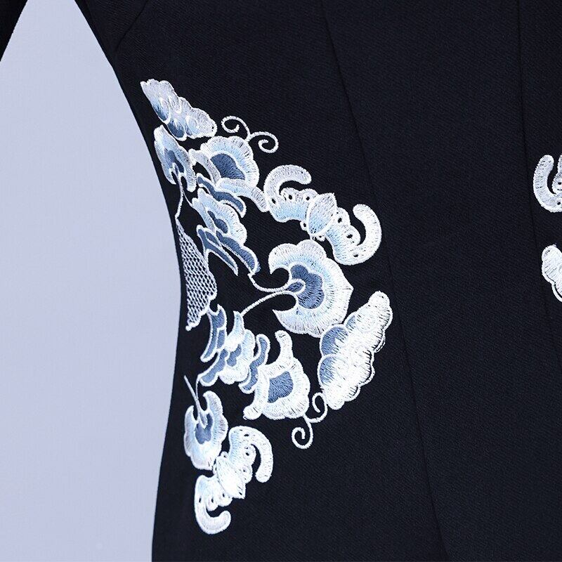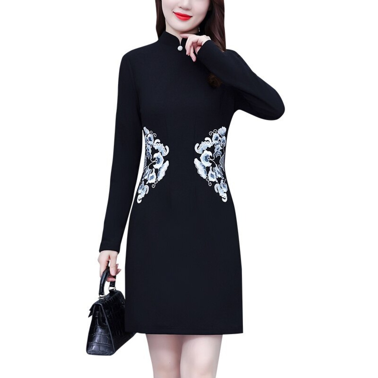 秋の女性の中国風のステッチ刺繍長袖プラスサイズの女性のチャイナドレス黒スリムドレス 4xl ロング ブラック 大きめサイズ オータム 秋物