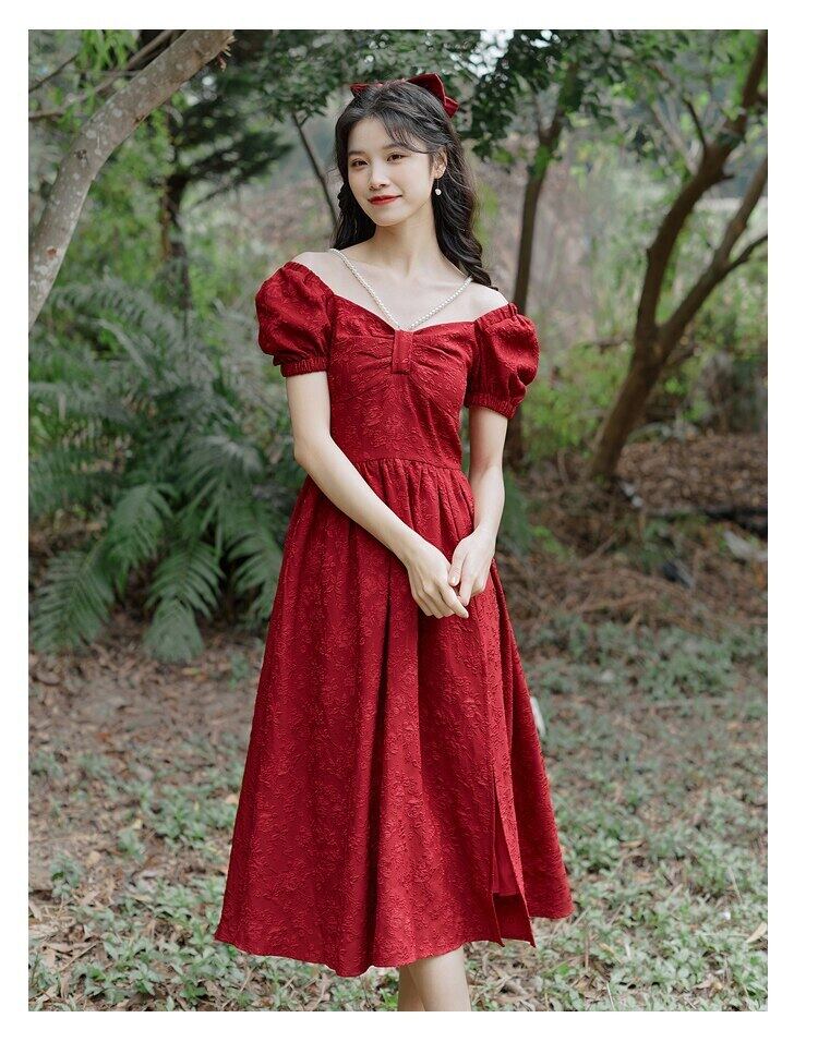 オフショルダーホワイトレッドドレスウェディング女性ゲストコートスタイルジャカードウエストティードレス