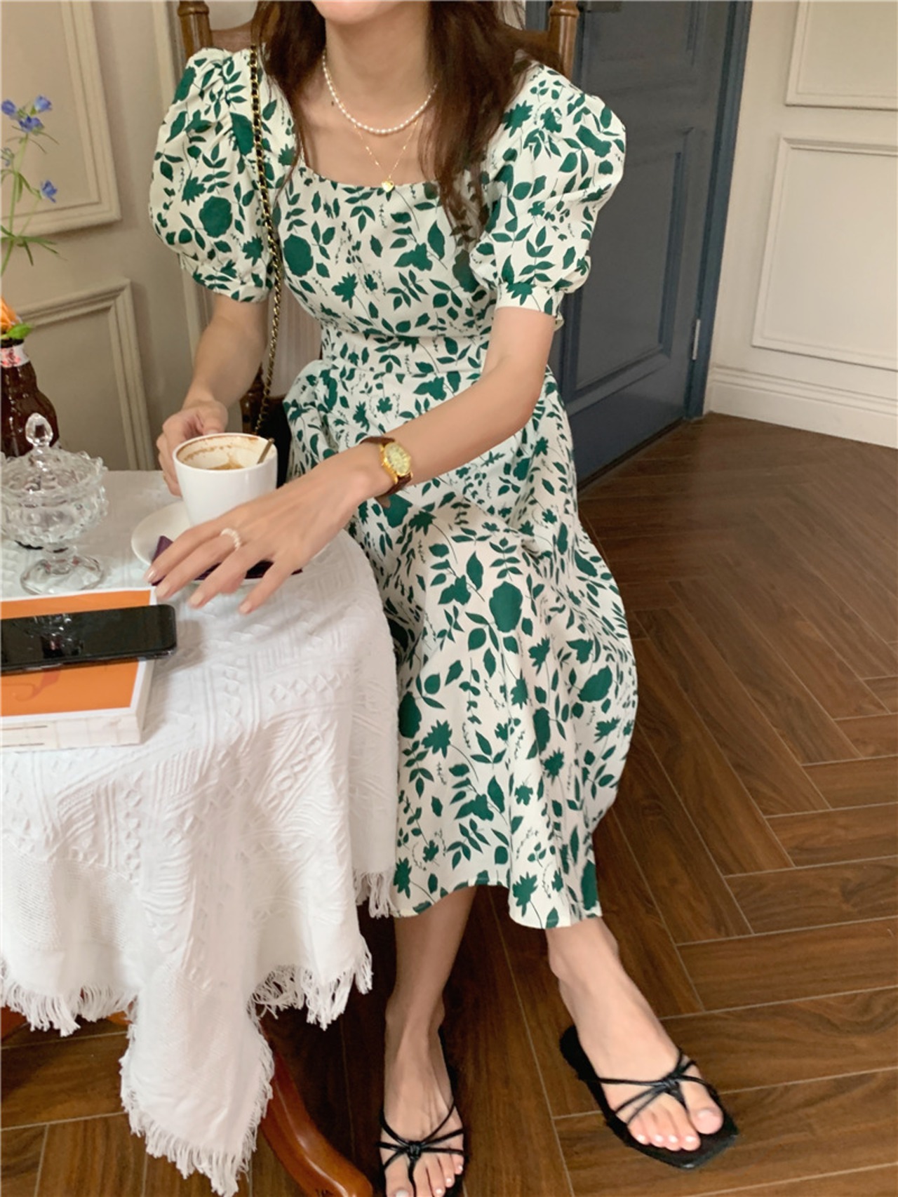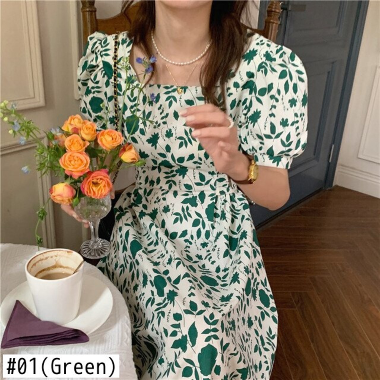 2022 半袖スリムウエスト A ラインミッドレングスドレス女性の夏の花柄スクエアカラードレス ショート ハーフスリーブ サマー 夏物 Aライン スクウェア